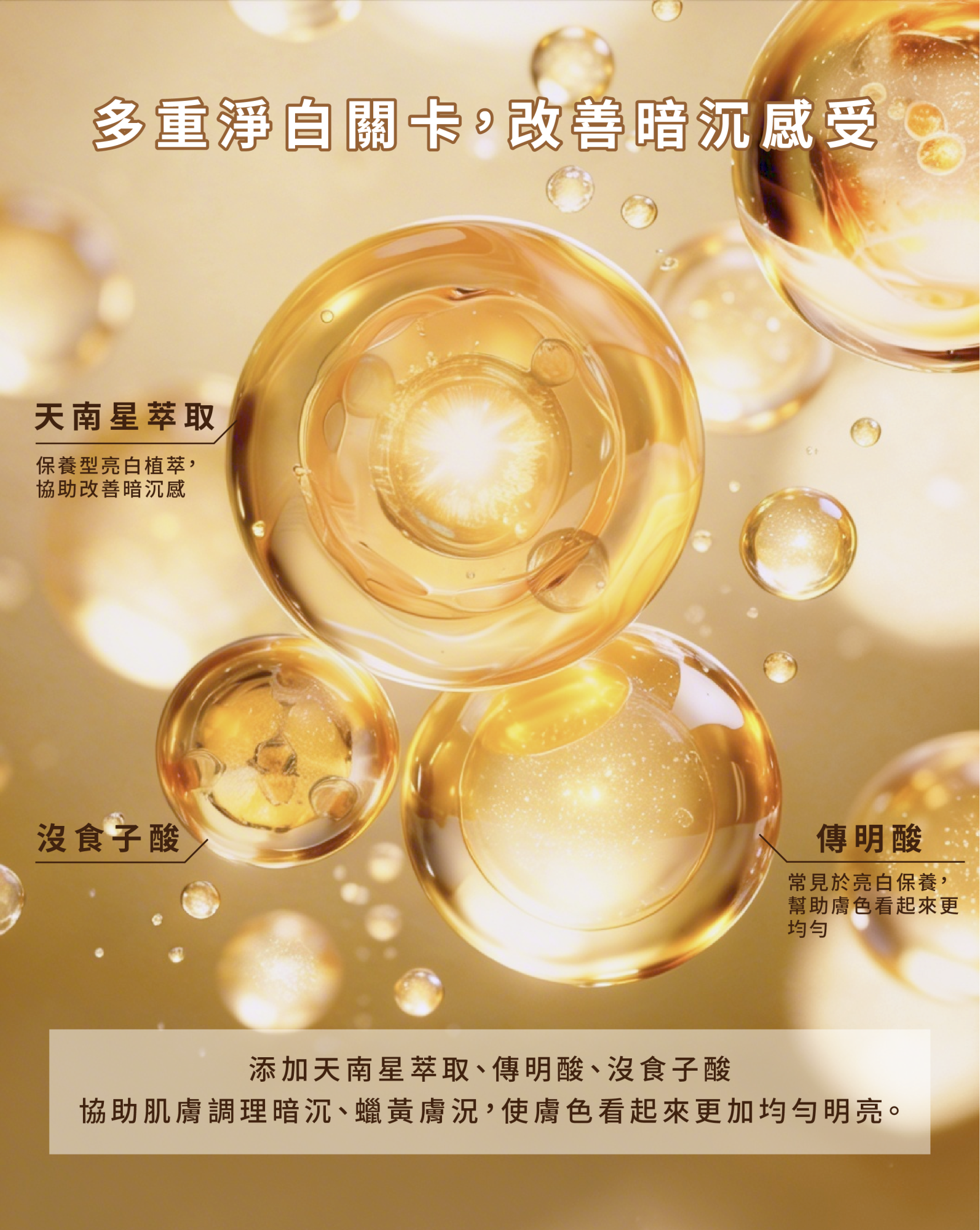 主成份:天南星萃取、傳明酸、水晶高光肽、酵母萃取、沒食子酸、毛瑞櫚果油、仙桃仙人掌莖萃取、玻尿酸。