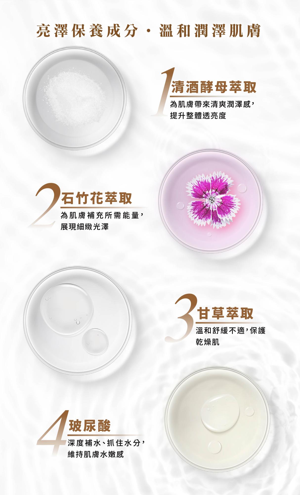 主成份:清酒酵母萃取、石竹花萃取、甘草、玻尿酸、木糖醇保濕劑