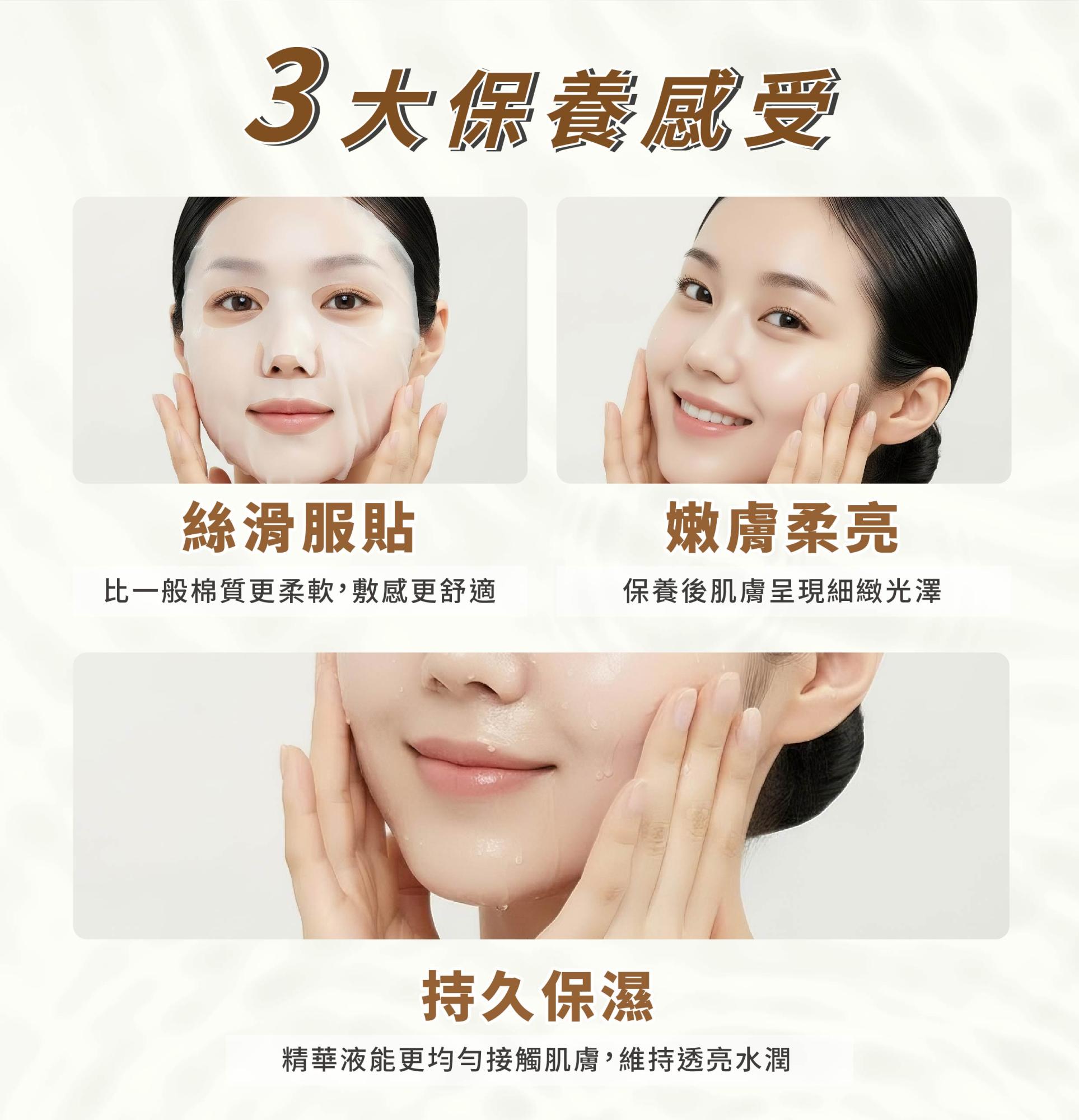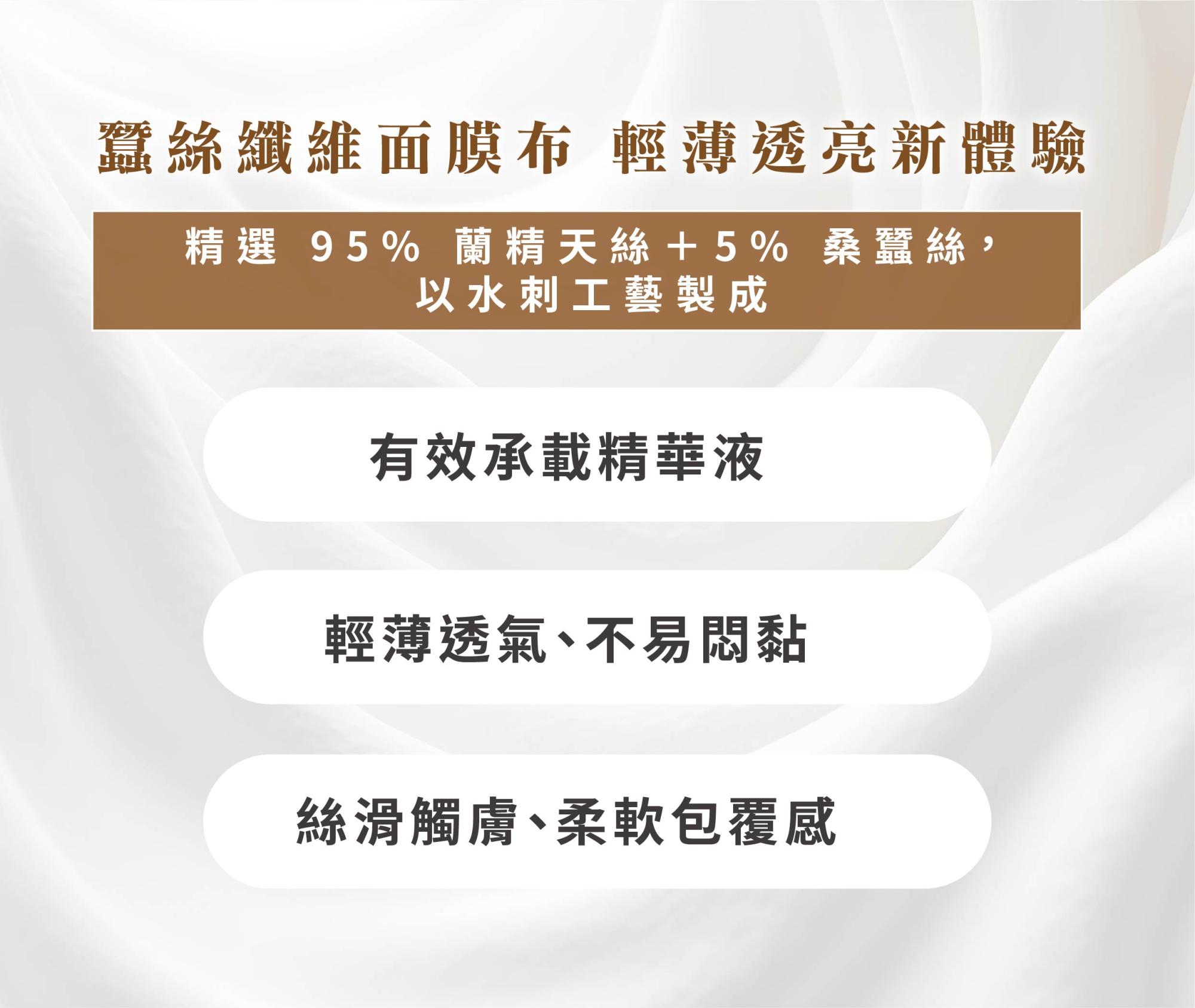 用途:採用隱形貼膚、輕薄透氣的蠶絲面膜布,清酒酵母萃取搭配石竹花萃取等亮白成份,深入肌底,改善暗沉與緊緻肌膚,讓您擁有透亮光澤彈潤肌。