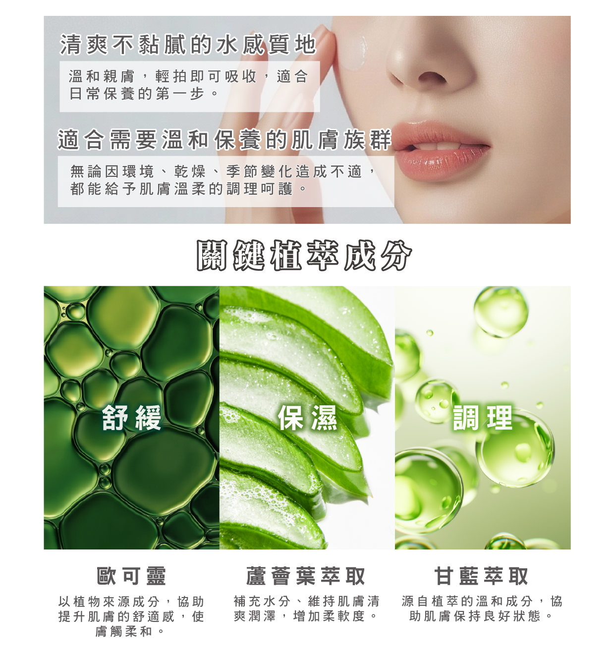 用途:運用多重植物萃取舒緩柔嫩嬌顏,調理肌膚狀態,使其健康有活力。