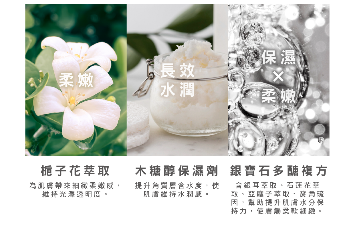主成份:歐可靈、蘆薈葉萃取、甘藍萃取、梔子花萃取、木糖醇保濕劑、銀寶石多醣(銀耳萃取、石蓮花萃取、亞麻子萃取、麥角硫因)。