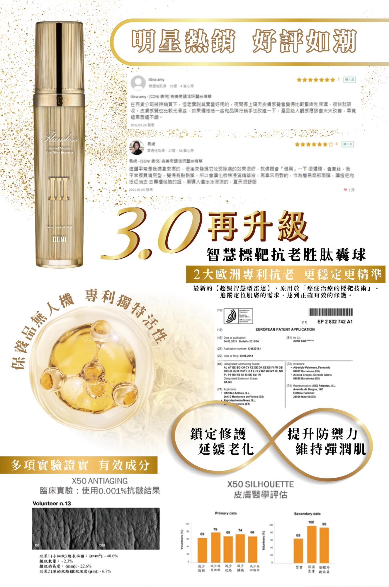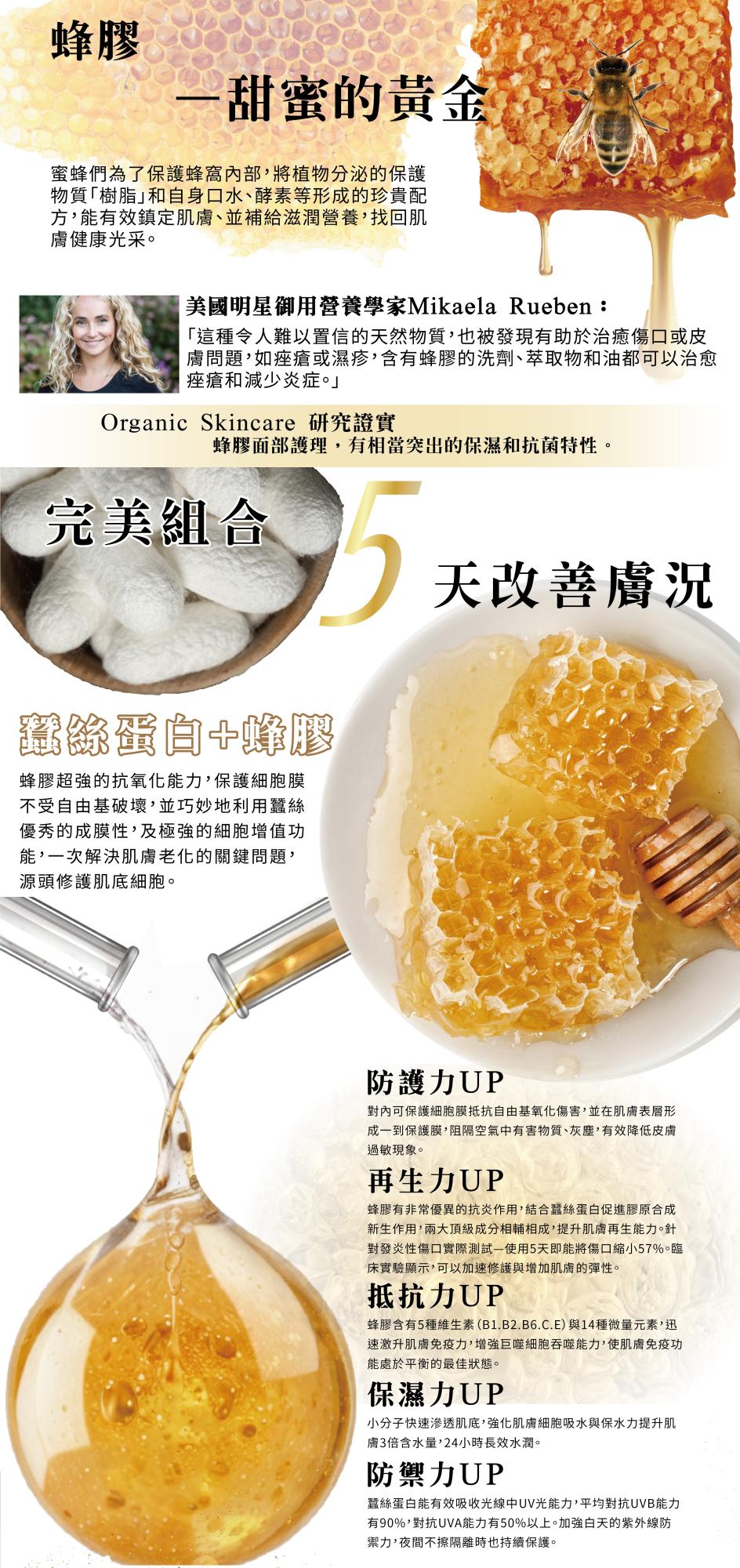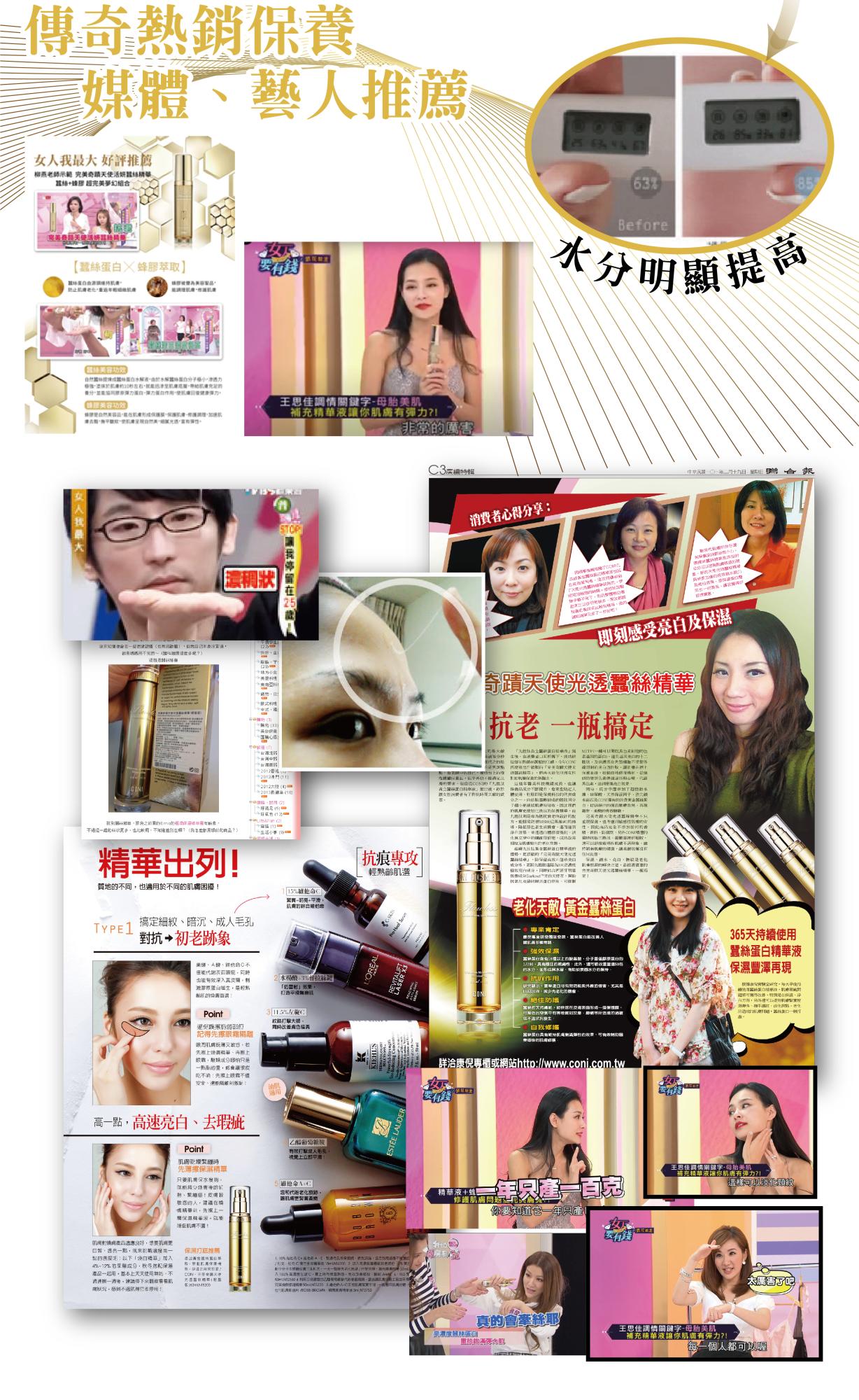 主成份:靈芝植泌、蜂膠、天使花萃取、紅花花蕾萃取、抗老胜肽囊球、鎖水磁石、MVP白金四胜肽、水稻萃取、水解蠶絲蛋白、歐洲七葉樹籽萃取